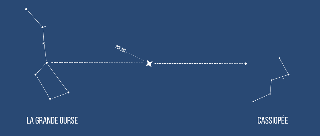 La Grande Ourse et Cassiopée se font toujours face (à peu près) dans le ciel et l’étoile polaire (Polaris) se trouve à mi-distance entre ces deux constellations. Une fois que vous avez trouvé la Grande Ourse, prenez la jointure entre le manche et la casserole et tracer une ligne droite jusqu’à la polaire, poursuivez cette ligne et à peu près à la même distance de l’autre côté se trouve Cassiopée. Comment ça vous n’avez pas trouvé l’étoile polaire ?! Allez voir cet article !